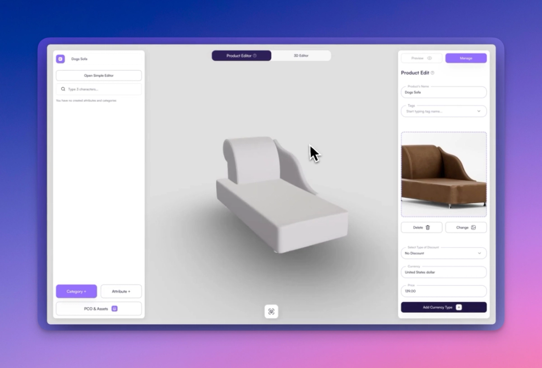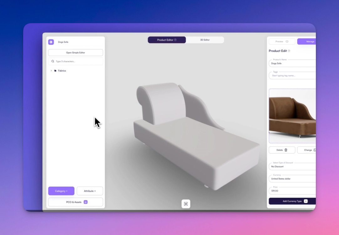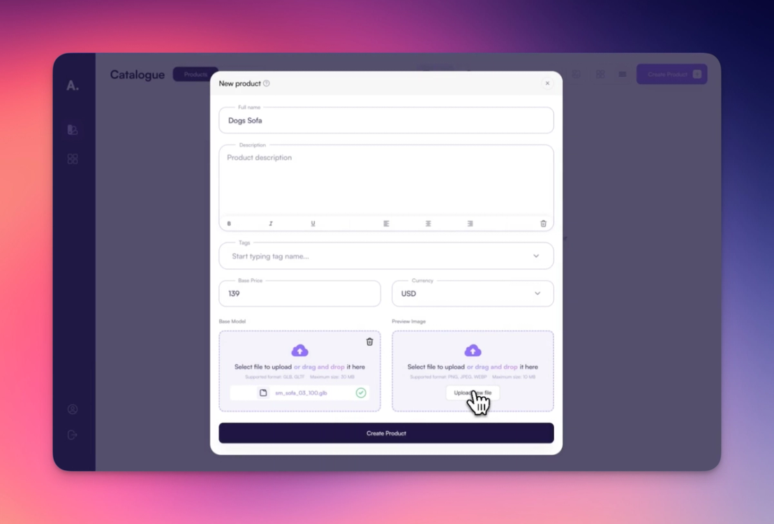Begin by clicking "Create Product" from your dashboard. Add basic product information, such as name, description, price, and a preview image. You’ll also upload the base 3D model of the sofa—this is the foundational asset your configurator will work from.