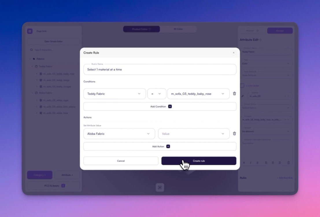 - Each rule should consist of a Condition (e.g., "If Fabric is selected")