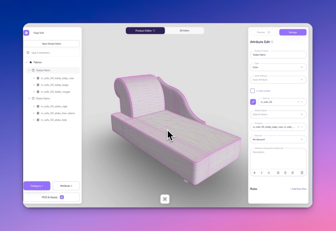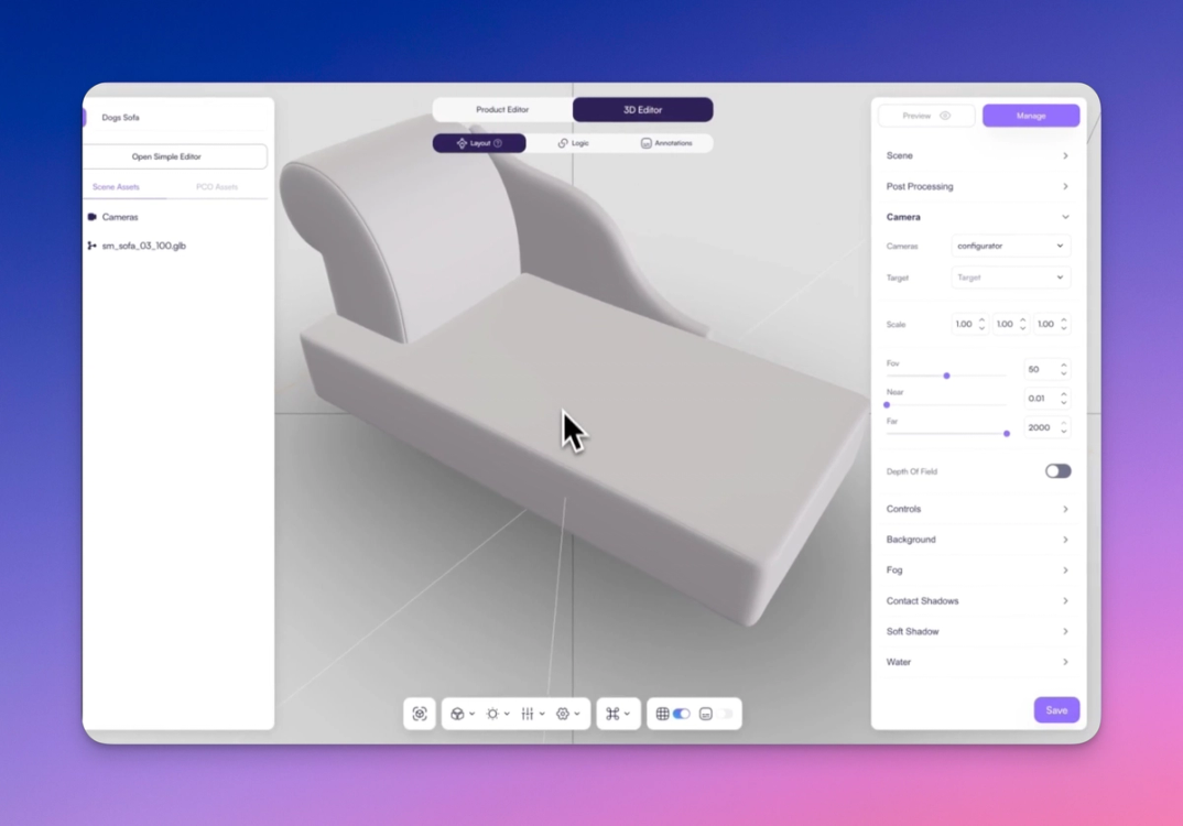 Once your assets are uploaded, click the 3D Editor button. This is where your configuration logic and presentation are defined. You’ll see two key sidebars: