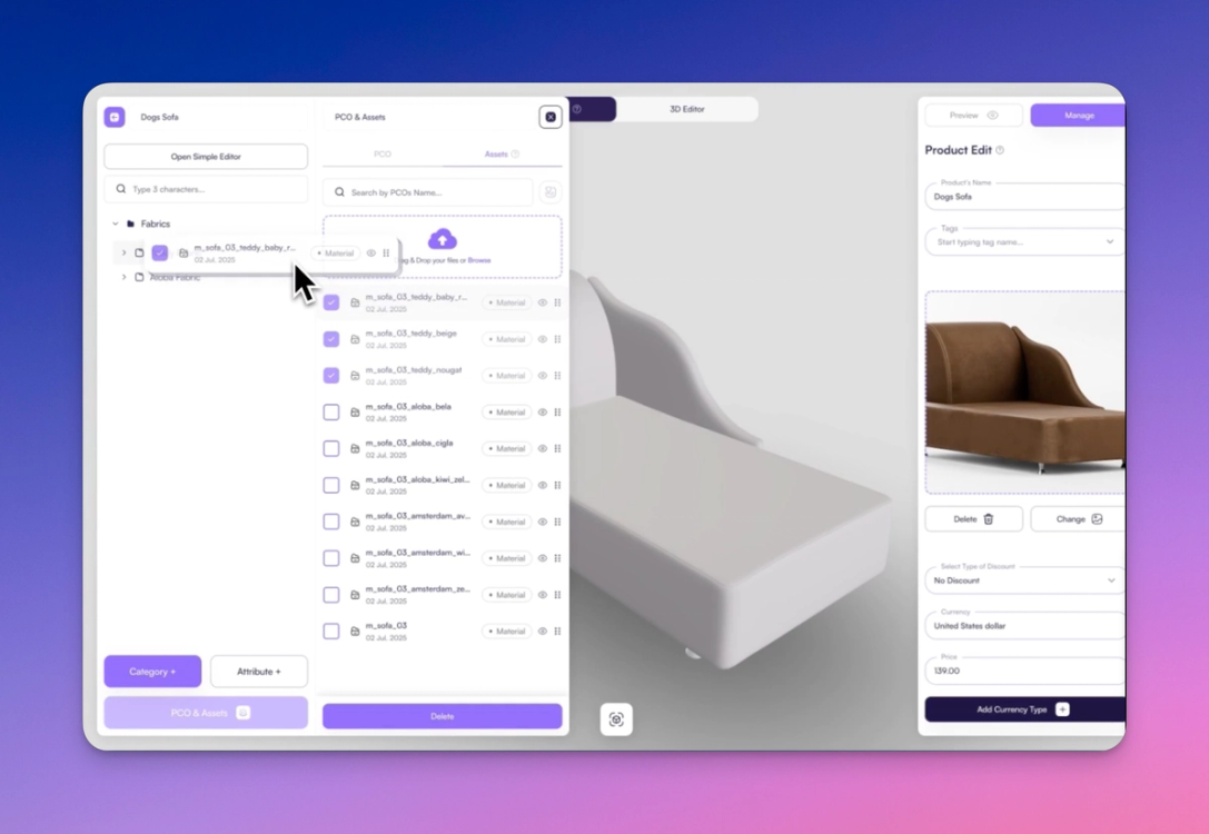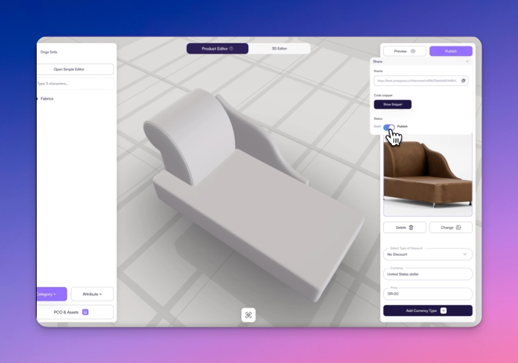 Creating an interactive 3D sofa configurator may sound complex, but with Amaspace, it’s a straightforward and guided process. This step-by-step tutorial will walk you through building a working configurator for a multi-material, multi-color sofa—ready to deploy on your storefront.